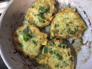 Boter in een braadpan opwarmen, hoopjes van het mengsel er in verdelen, platten, en op zacht