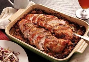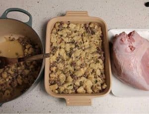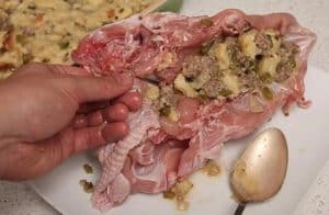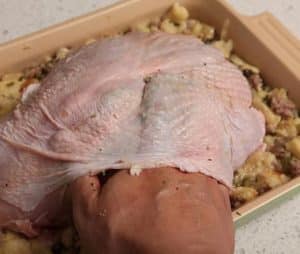 - Vul de holte van de kalkoen borst met een deel van de vulling. Verdeel de rest in een beboterde braad pan.