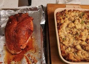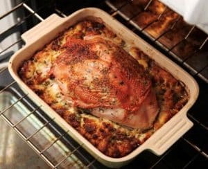 - Terwijl de kalkoen uit de oven even tot rust komt zet de vulling weer ongeveer 10 minuten terug om een korstje te krijgen