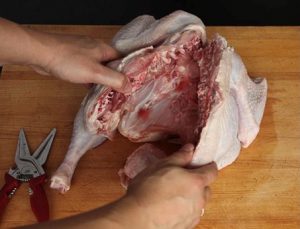 Met alle kracht druk met beide handen neer op de kalkoen en breek het borst been.