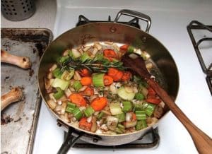 - In dezelfde pan gaar de groente en kruiden zachtjes, al roerende, ongeveer 8 minuten. Niet verbranden.