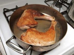 - Haal de poten voorzichtig uit de pan met een platte schuimspaan als ze dreigen uit elkaar te vallen, diep bruin zijn van kleur, en de saus goed ingedikt is. Leg ze alvast op een warm serveer bord.