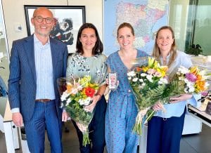 Wie ik trouwens graag aan u wil voorstellen (zie de foto onderin deze post) zijn vier kanjers die van groot belang zijn voor het dagelijkse reilen en zeilen op de ambassade. Ik greep de jaarlijkse nationale Secretaressedag aan om collegaโs Suzanne, Cynthia, Stephanie รฉn Rens (op de foto verstopt op het beeldscherm van een telefoon) in het zonnetje te zetten en te bedanken voor hun onafgebroken grote inzet. ยกMuchรญsimas gracias!
