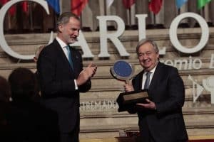 Deze week was ik ook aanwezig namens ons land bij de uitreiking van de zeer prestigieuze Karel de Vijfde prijs die werd uitgereikt door Koning Felipe VI. De uitreiking is elk jaar in het prachtige klooster in Yuste, een paar uur rijden van Madrid. Dit jaar ging de eer naar Antonio Guterres, de Secretaris-Generaal van de Verenigde Naties. Hij kreeg de prijs onder andere voor zijn bijdrage aan de vluchtelingenproblematiek als voormalig chef van de VN Vluchtelingenorganisatie – en uiteraard voor zijn pogingen om te komen tot vrede en veiligheid in de wereld. Namens Nederland heb ik de heer Guterres gefeliciteerd.