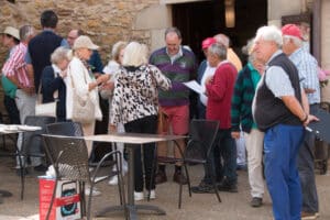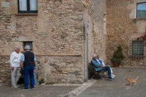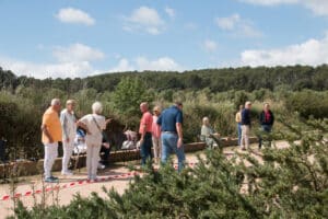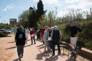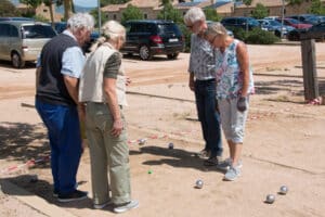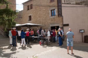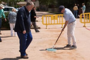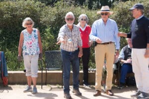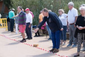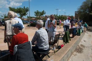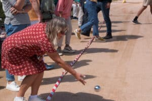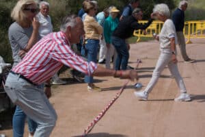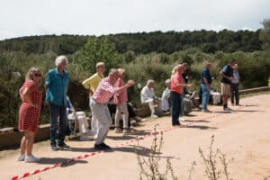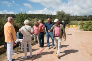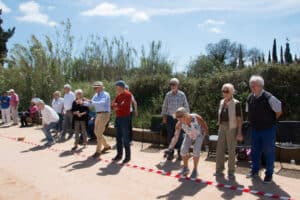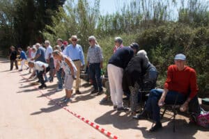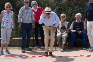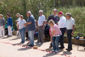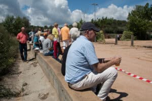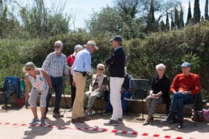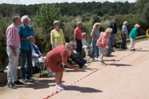 Op het mooie plein bij restaurant Can Dolç was de ontvangst met koffie en een écht grote croissant om ons energieniveau op te krikken. We waren er klaar voor. Alle deelnemers kregen op papier uitgereikt met welke teams en op welke banen men speelde, per team werd een verantwoordelijke of poulemeester voor de puntentelling aangesteld.