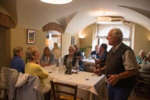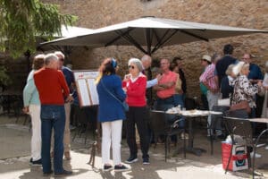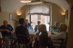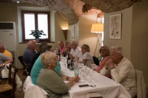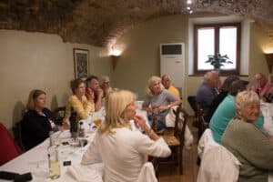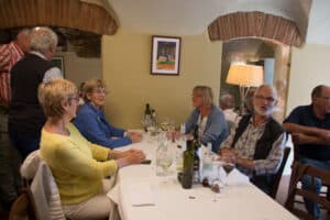 Na enige twijfel over lunchen op het buitenterras werd vanwege de weersvoorspelling gekozen voor de pica pica lunch in de verschillende ruimten van restaurant Can Dolç. We genoten van een keur aan heel diverse tapas, er werd ruim voorzien in drank en daarna kon men een dessert kiezen met koffie tot besluit.