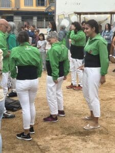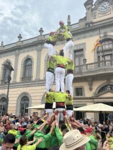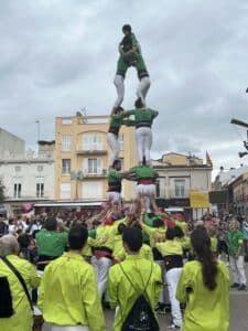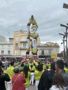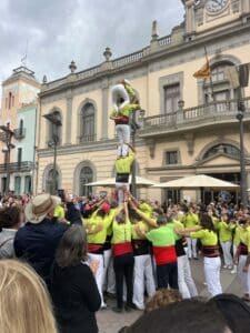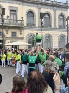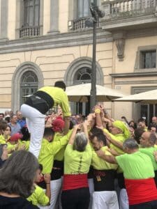 Welgeteld vijf druppels regen vielen er tijdens het stappen zetten. Dat mag natuurlijk geen naam hebben. We hadden, zoals vaak, weer heel veel geluk bij dit traditionele festijn. Daarna kwam iedereen bijeen op het Plaza Cataluyna om naar de spectaculaire Castellers van San Cristo d’Aro en Laietans de Santa Coloma de Gramanet te kijken, die hun menselijke kasteel bouwden. Werkelijk adembenemend en met name hield men het hart vast toen de jonge ‘spillebenen’ helemaal naar boven klommen.