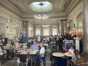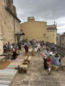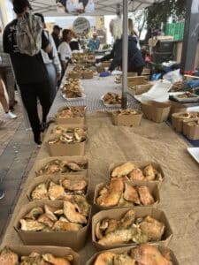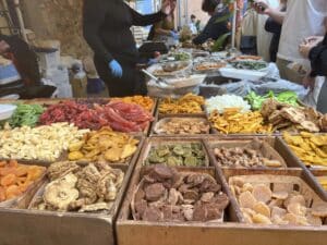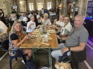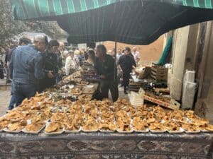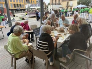 Vervolgens stond het een ieder vrij om de Fira de bolet, over het gehele dorp uitgestrekt, te bezoeken. Er was een overweldigend aanbod van alle mogelijke soorten paddenstoelen en streekproducten. Met hun inkopen verzamelden de deelnemers daarna in het rustieke Casino om van een paddenstoelenlunch te genieten. Vanwege de grote drukte daarbinnen viel het gezelschap in groepjes uiteen om een tafel te veroveren.