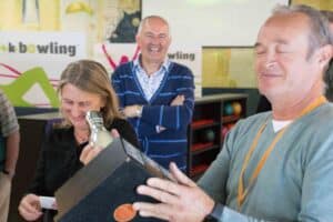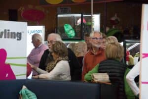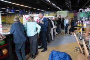 Welkom geheten door de voltallige evenementencommissie (EV) werden meteen ieders onderdanen van de bekende stoute schoenen voorzien. Er was een welkomstwoordje door voorzitter Roel van Veggel die twee introducees aan ons voorstelde. Allereerst vroeg Roel ons om toch vooral voorzichtigheid in acht te nemen met het oog op bijzondere gladheid. Deze waarschuwing geldt voor de zogenoemde ‘Foul line’, de lijn tussen aanloopzone en bowlingbaan. Hoewel de benaming anders doet vermoeden namen wij deze waarschuwing uiteraard heel serieus. Dat de banen waren geolied om de ballen enigszins in gewenste banen te leiden was zoals te verwachten.