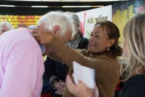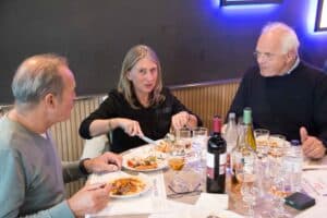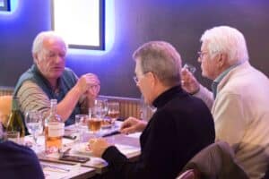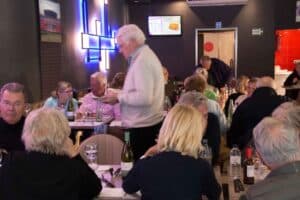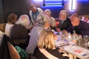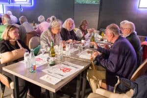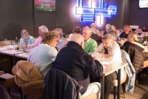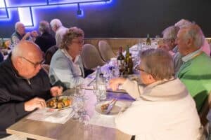 Aansluitend namen we plaats aan de tafels in restaurant Wok Gu. Aan onze rechterkant was in twee rijen een Aziatisch buffet met schalen vol met de meest denkbare vis/vlees/groentegerechten opgesteld. De grootste opscheppers mochten het eerst met een bord langs al het lekkers, waaruit het nog niet zo gemakkelijk kiezen was. Onze gerechten werden begeleid door lekkere wijnen en een gezellige babbel. Ook het dessert-buffet werd goed bezocht en nadat de koffie was geserveerd werd vrolijk afscheid genomen.