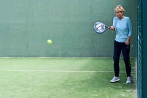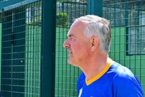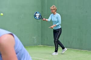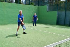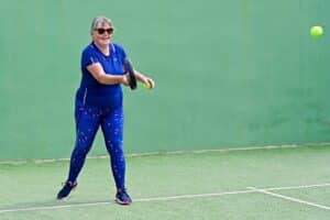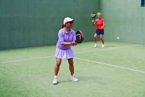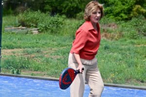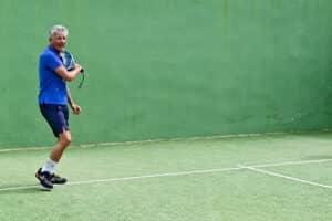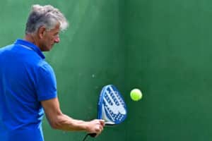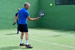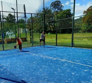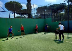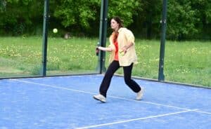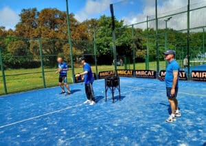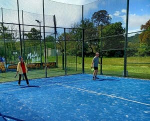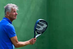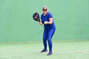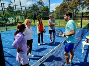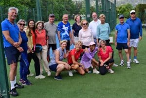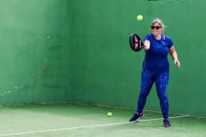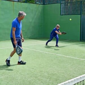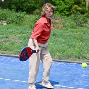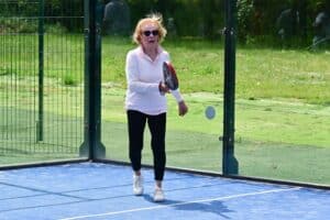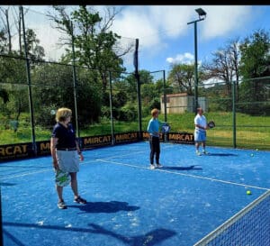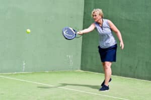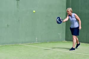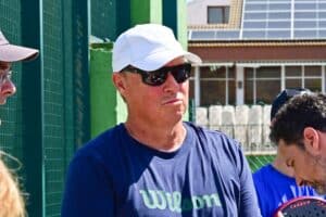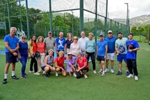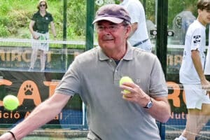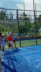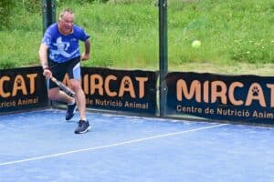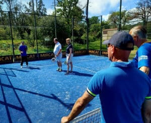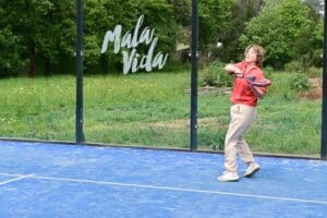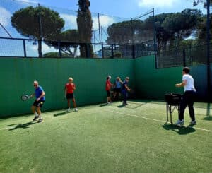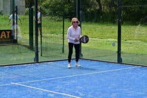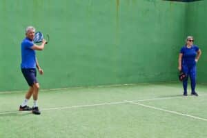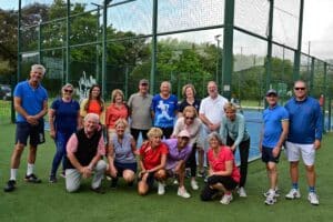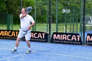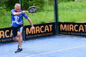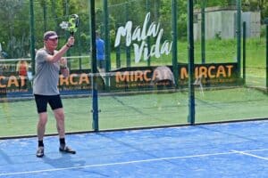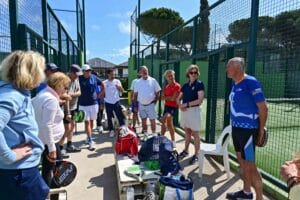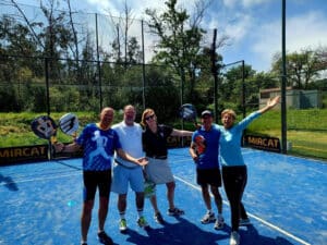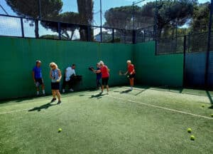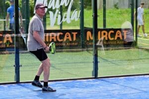 Ondanks het wisselvallige weer verzamelden zich bijna vijftien sportievelingen op de padelbaan in Platja d’Aro. Leuk om ook wat nieuwe gezichten te zien! Menigeen had diep in de kledingkast moeten graven naar iets sportiefs. Mijn outfit had zó lang in kasten, koffers en opslag gelegen dat het elastiek het had opgegeven. Daarmee werd pijnlijk duidelijk hoe lang ik al geen enkel racket of batje meer had aangeraakt.