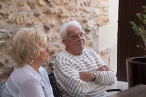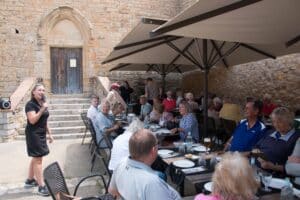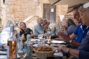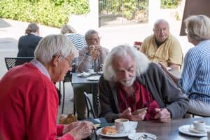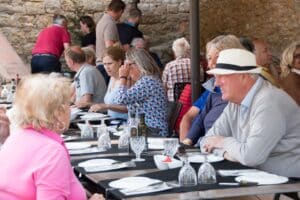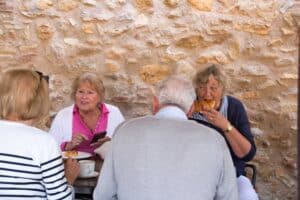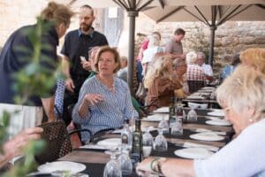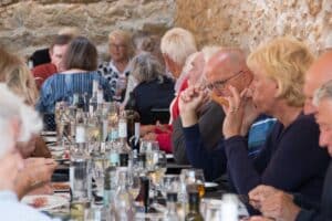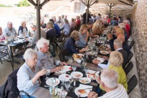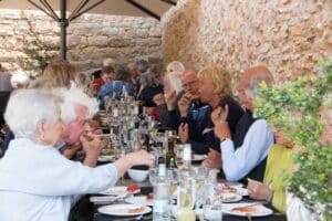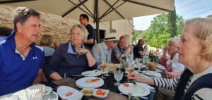 Na afloop verplaatst iedereen zich naar het restaurant. Onze knorrende magen verheugen zich op de pica-pica’s. Dankzij het droge weer, kunnen we buiten aan tafels eten. De (al dan niet passende) wijn vloeit gul. Nu maar hopen dat een ieder zijn eigen BOB mee heeft. Al is het hoekje wat tochtig, het drukt de pret niet. Vestjes aan, glaasjes vol, en de sfeer zit er goed in tot vertrek naar huis: hogar dulce hogar.