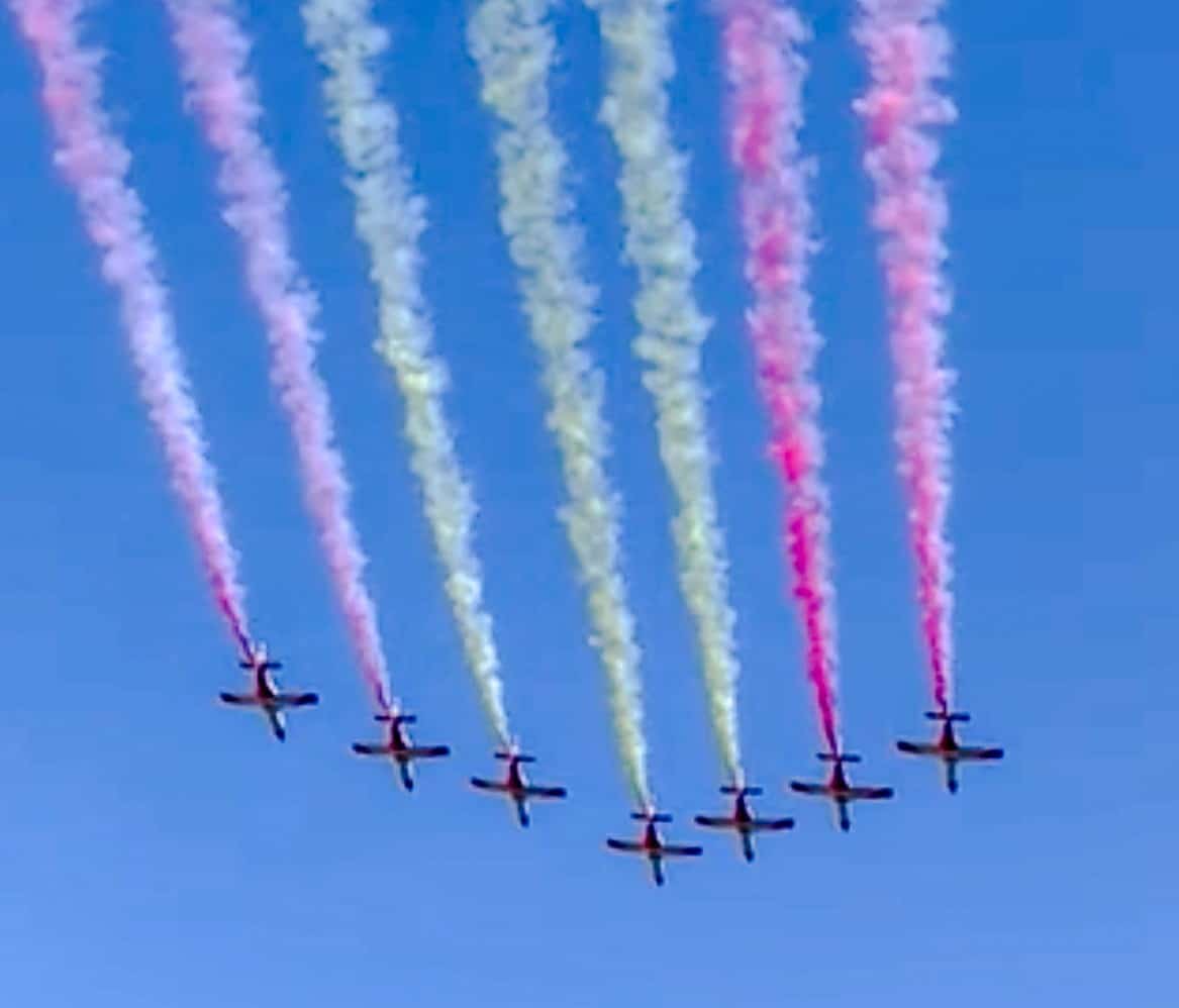 Daarna volgden allerlei vliegtuigen, van gevechtstoestellen tot helikopters. En stuntvliegers die de Spaanse vlag in gekleurde banen in de lucht achterlieten.