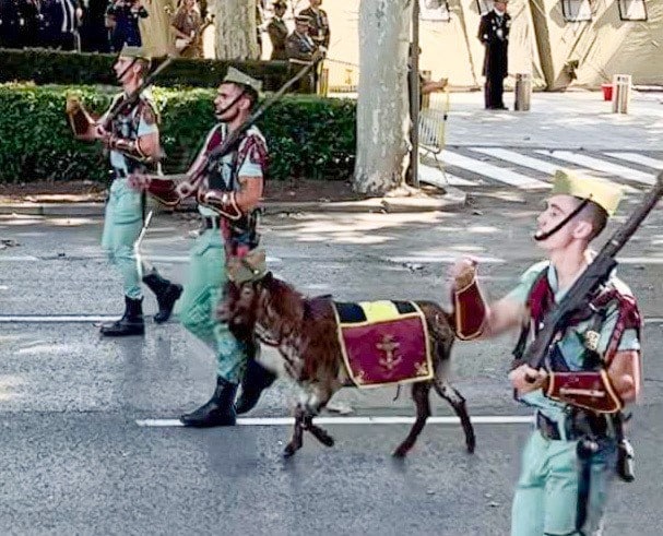 Spanje heeft een grote variëteit aan militaire onderdelen. Naast landmacht, luchtmacht en marine hebben ze ook wat exotisch aandoende regimenten zoals die in de exclaves Ceuta en Melilla. Die militairen hebben ook Marokkaanse fez hoeden op. Het hoogtepunt voor mij was toch wel het Spaanse vreemdelingenlegioen. Ze hadden hun mascotte – een gigantische